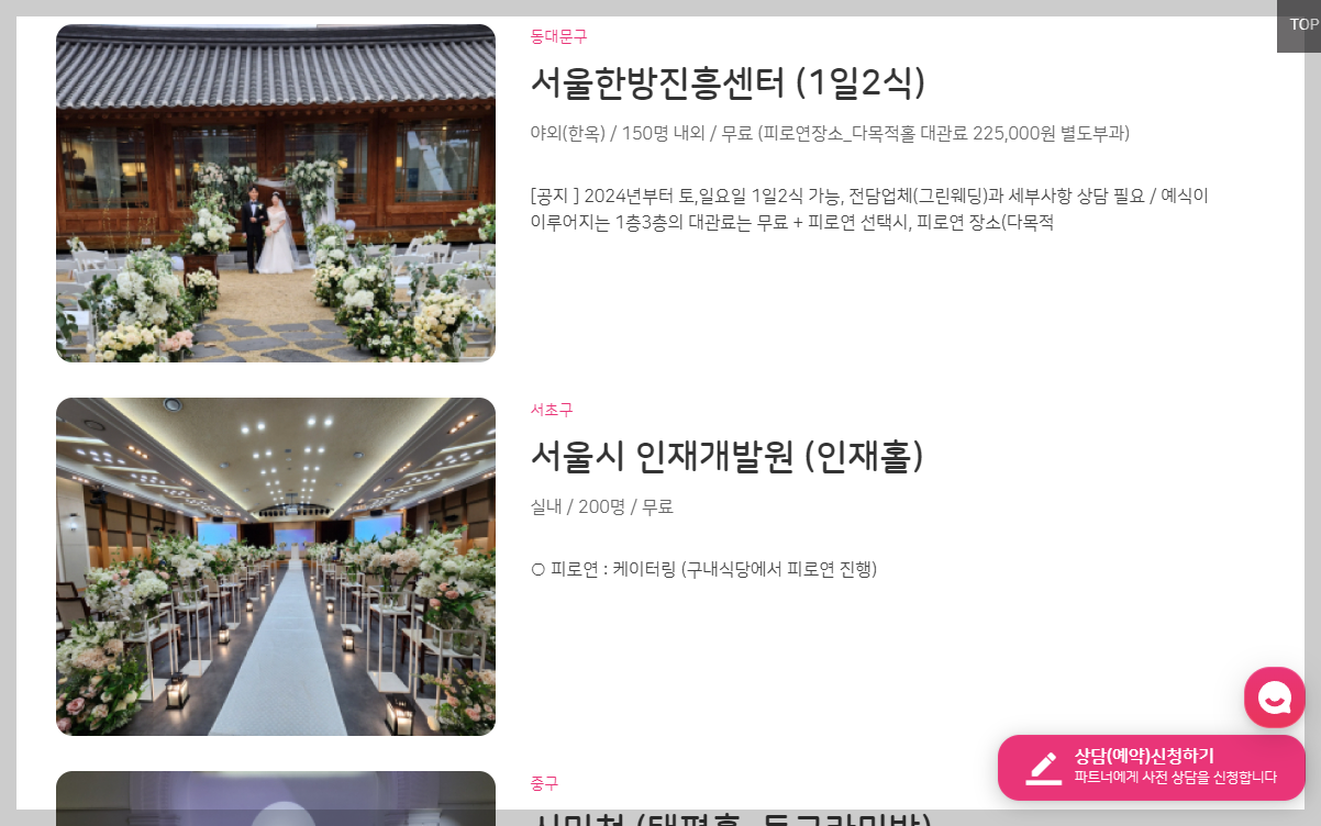 얼마전 결혼 중매 프로그램에서 결혼식장 비용이 억 단위인 곳도 있다는 걸 보고 정말 깜짝 놀랐는데요. 실속 있게 아름다운 곳에서 결혼식을 하고자 하시는 분이라면 신청해 이용해 보시길 추천드립니다.