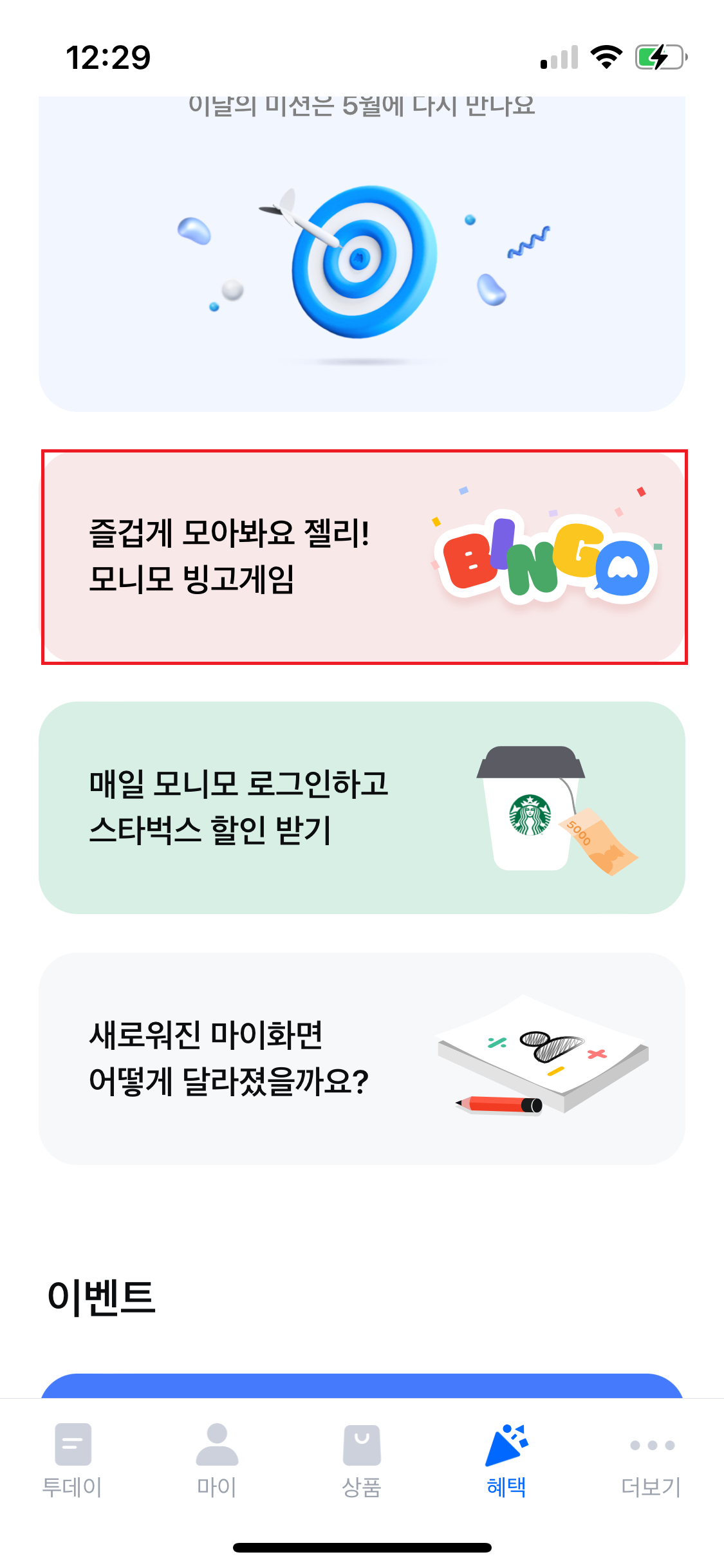 지금 진행 중인 이벤트인 [2주년 메달을 찾아줘]와 [모니모 빙고게임], [걷기]를 진행했습니다.