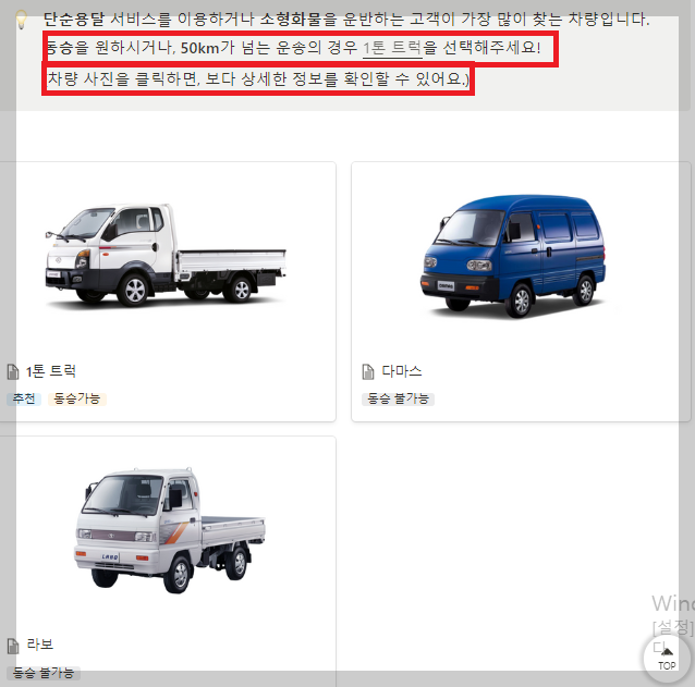 차량 사진을 선택하면 차량마다 운반가능한 짐의 양을 확인할 수 있습니다. 동승을 원하거나 이동거리가 50km이상인 경우 1톤 트럭만 가능합니다