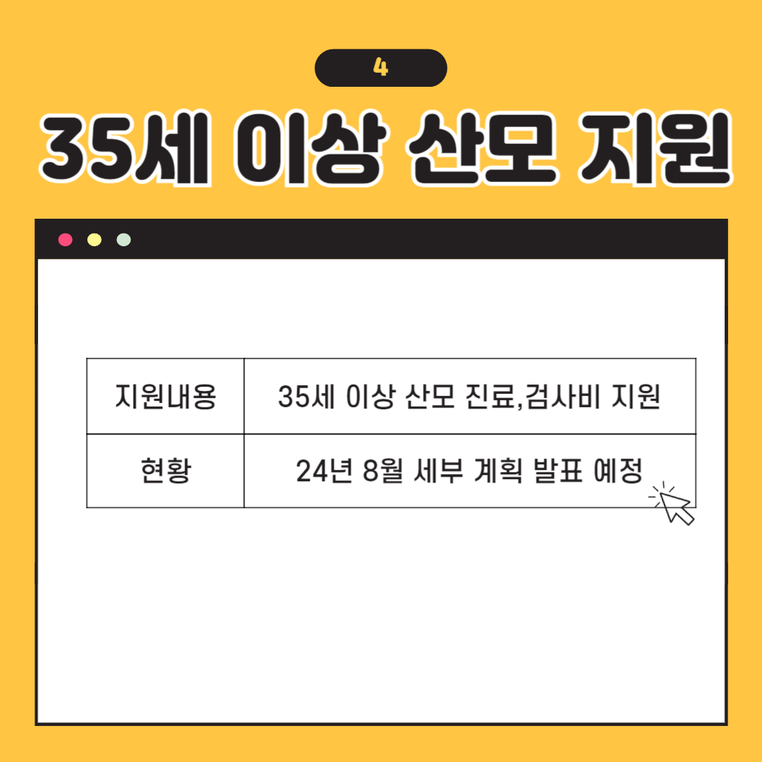 35세 이상 산모를 대상으로 외래 진료 및 검사 후 서류 첨부해 신청이 가능하다고 합니다. 아직 24년 8월까지는 사업추진을 위한 사전절차 진행 예정으로 구체적인 시행시기나 소급지원 등에 대한 내용은 추후 나오는 데로 올리도록 하겠습니다.